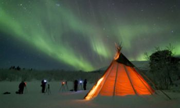 Un campamento con una “kota”, la cabaña tradicional lapona, donde podremos esperar a la Aurora Boreal de modo confortable. Se puede llegar al lugar sentados en un trineo con asientos tirado por la motonieve del guía o conduciendo una motonieve.